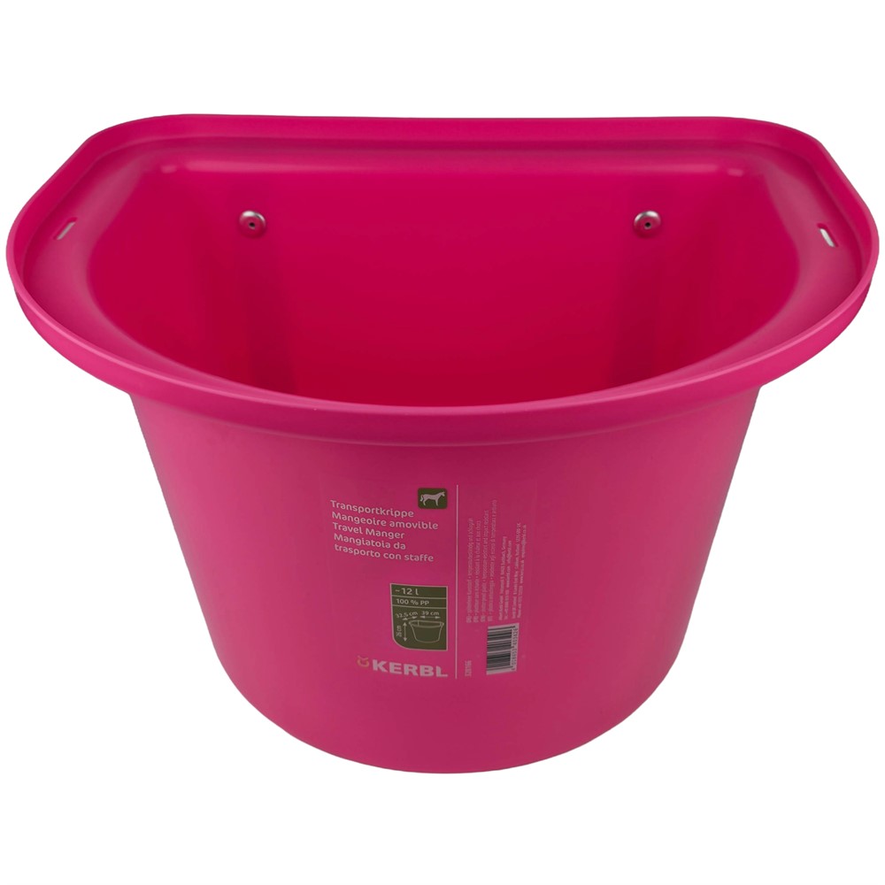 Rosa transportkrubba med platt baksida och 2 metalbyglar som gör att man lätt kan hänga upp den på ex. boxväggen eller liknande. Smidig att ha med vid exempelvis resor eller tävlingar.