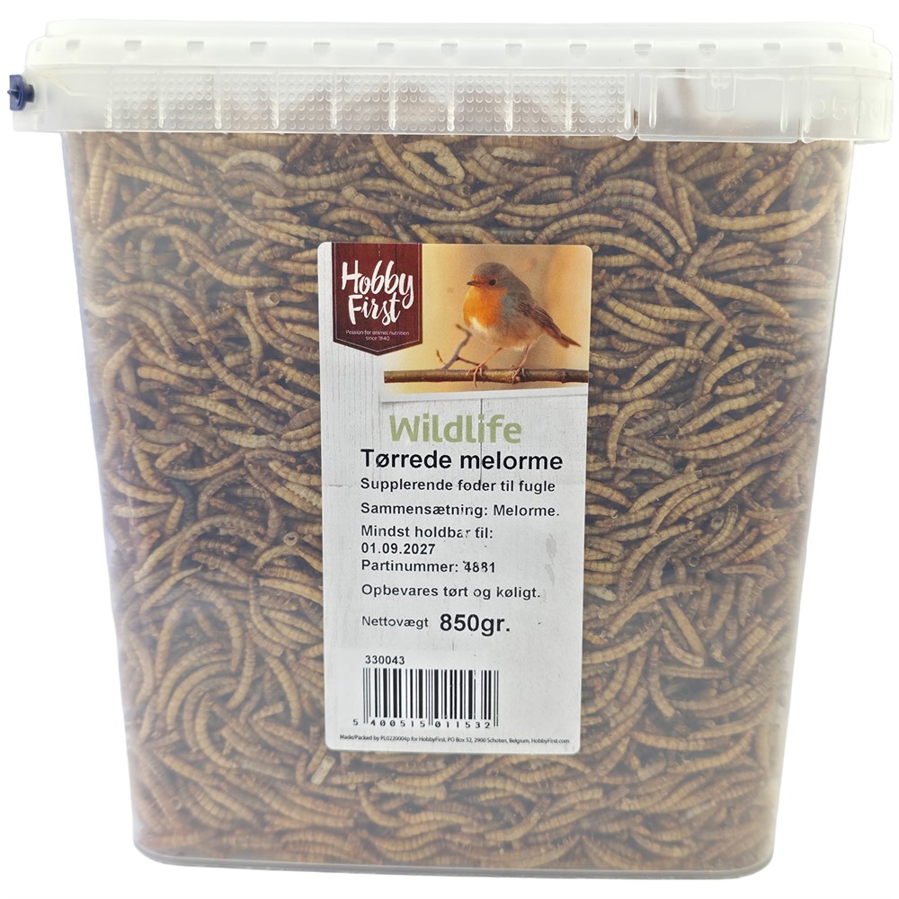 Hink med 850 gram torkad mjölmask. En proteinrik föda som passar utmärkt till många av trädgårdens vilda fåglar.