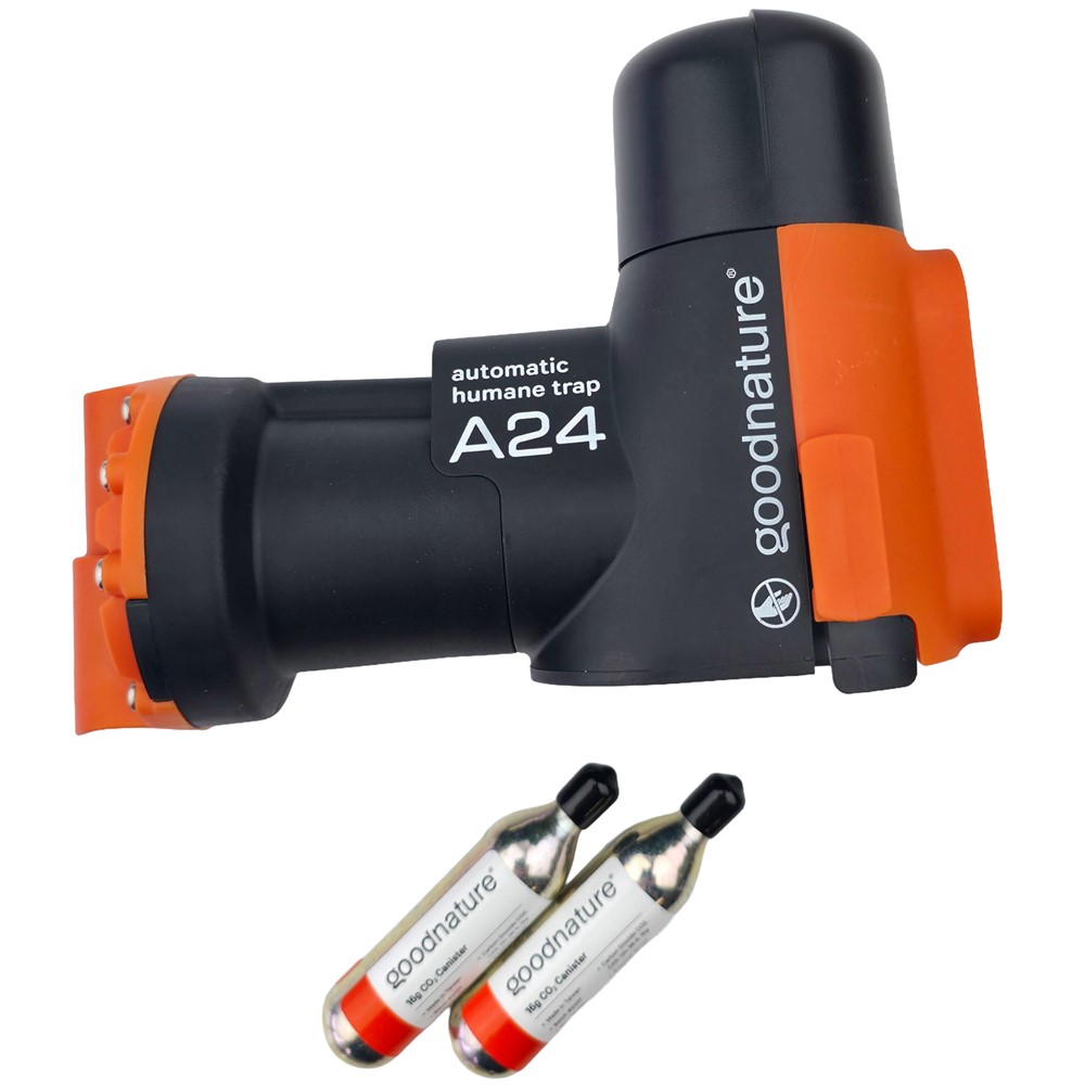 I detta produktpaket ingår utöver A24-fällan även 2 stycken CO2-patroner. Det medföljer även ett fäste för montering av fällan på en trädstam eller stolpe i trädgården.