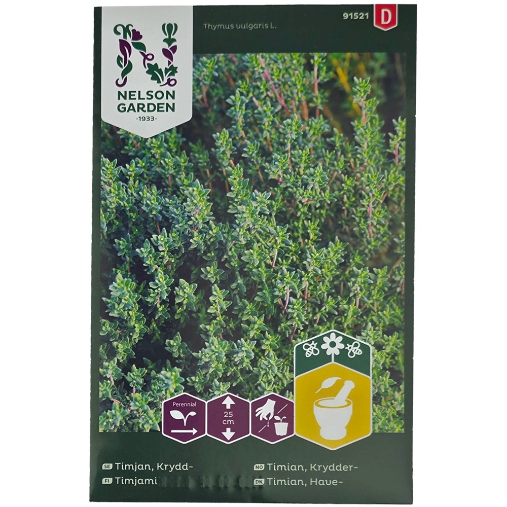 Kryddtimjan är en lättodlad och vintergrön kryddväxt med aromatiska blad. De rosalila blommorna lockar till sig bin. Bladen skördas efter hand och används färska eller torkade.