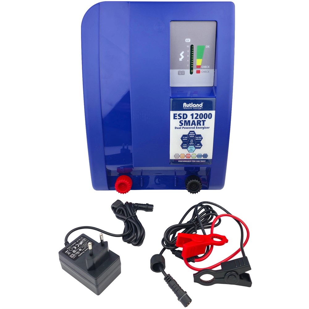 Rutland ESD 12000 SMART är ett appstyrt elstängselaggregat som kan drivas antingen med 12 V batteri eller via 230 V nätanslutning. Aggregatet klarar långa stängsel (upp till 50 km stängsel vid liten påverkan från vegitation) tackvare 12J lagrad energi och 8J utgående energi.